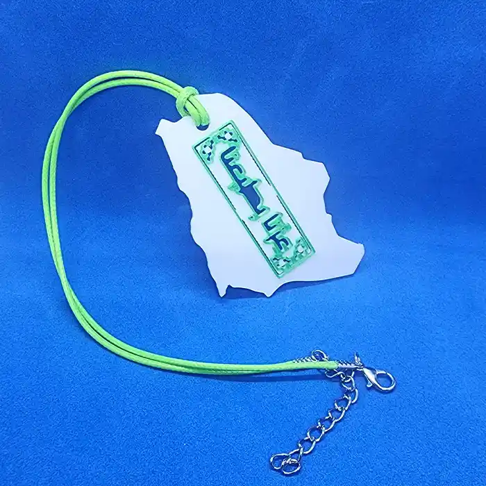 💚تعليقة بتصميم خريطة المملكة العربية السعودية محفور عليها شعار “عزّنا بطبعنا” باللون الأخضر، مع سلسلة قماشية بنفس اللون.